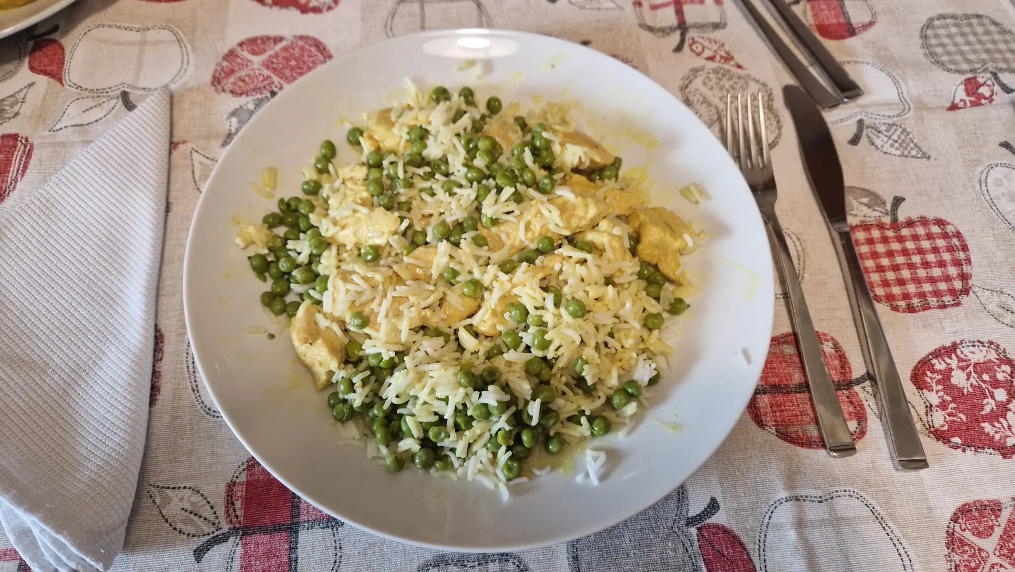 Pollo al curry con riso e piselli